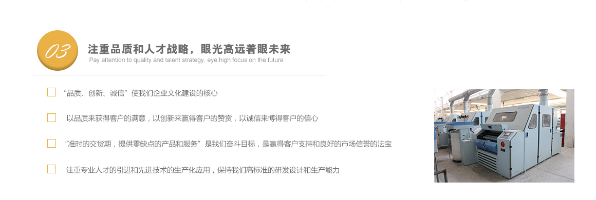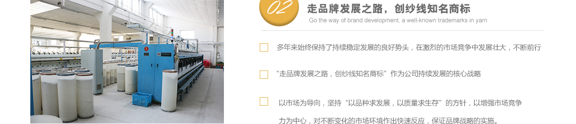 太倉市高陽工貿有限公司是專業從事特種紗生產十數年的一線生產廠家,坐落于江蘇省蘇州市太倉市雙鳳鎮新湖建湖路29號,太倉隸屬長江三角洲經濟圈,交通便捷,經濟發達,是著名的紡織生產基地。 公司歷史要追溯到1982年就成立的新湖毛紡織廠。1996年,毛紡織廠與上海二十二棉在新湖聯合組建了太倉市新湖福利綜合廠。2002年為適應市場的飛速變化,公司轉制重組更名為太倉市高陽工貿有限公司。同時公司適時調整生產經營策略,調整產品品種結構,把生產特種紗作為主要發展方向,純棉、滌綸竹節紗是我們的主要產品。 公司多年來始終保持了持續穩定發展的良好勢頭,在激烈的市場競爭中發展壯大,不斷前行。我們把“走品牌發展之路,創紗線知名商標”作為公司持續發展的核心戰略。以市場為導向,堅持“以品種求發展,以質量求生存”的方針,以增強市場競爭力為中心,對不斷變化的市場環境作出快速反應,品牌戰略的實施。公司注重專業人才的引進和先進技術的生產化應用,具備較強的研發設計和生產能力。 公司一直把“品質、創新、誠信”作為企業文化建設的核心。以品質來獲得客戶的滿意,以創新來贏得客戶的贊賞,以誠信來博得客戶的信心。我們把“準時的交貨期,提供零缺點的產品和服務”作為奮斗目標,贏得了客戶的支持和良好的市場信譽。 高陽工貿有限公司愿與廣大客戶加強合作,共享信息,迎接挑戰,共同發展??蛻粜枨?。了解詳細>>